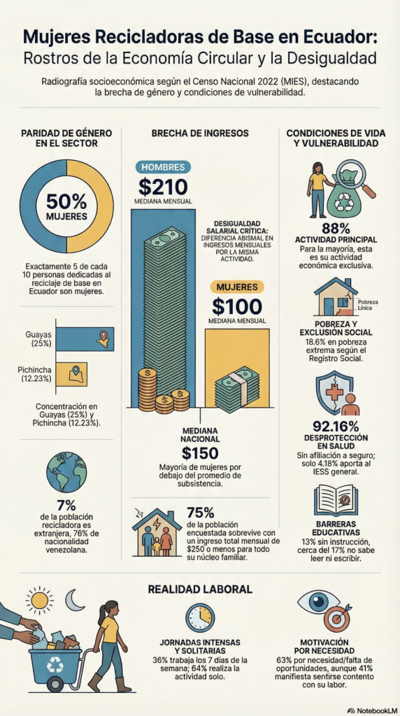 Según Renarec, las recicladoras formalizadas recuperan más del 80% del material reciclable en Ecuador. En Quito, más de 800 recuperadores han sido carnetizados y organizados en cooperativas. Un estudio de Fundación Avina muestra que recicladoras capacitadas aumentaron sus ingresos hasta en un 40%.