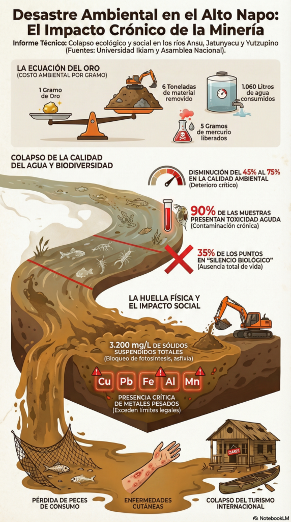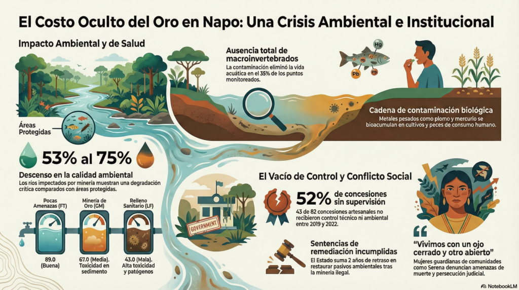Especial sobre minería en Napo. El desastre ambiental en Napo, evidenciado en el colapso de sus ríos y la contaminación de alimentos, es el resultado de un debilitamiento institucional. La Contraloría General del Estado y la Comisión de Transparencia de la Asamblea Nacional identificaron omisiones de control. Informes técnicos confirman que entidades como el Ministerio del Ambiente, Enami EP y Arcom permitieron que la mayoría de concesiones operaran sin fiscalización, facilitando delitos como el lavado de activos. Esta crisis, documentada también por la Universidad Ikiam, destruyó la seguridad de comunidades que hoy carecen de agua segura y enfrentan un aumento de la delincuencia organizada. Segunda entrega.